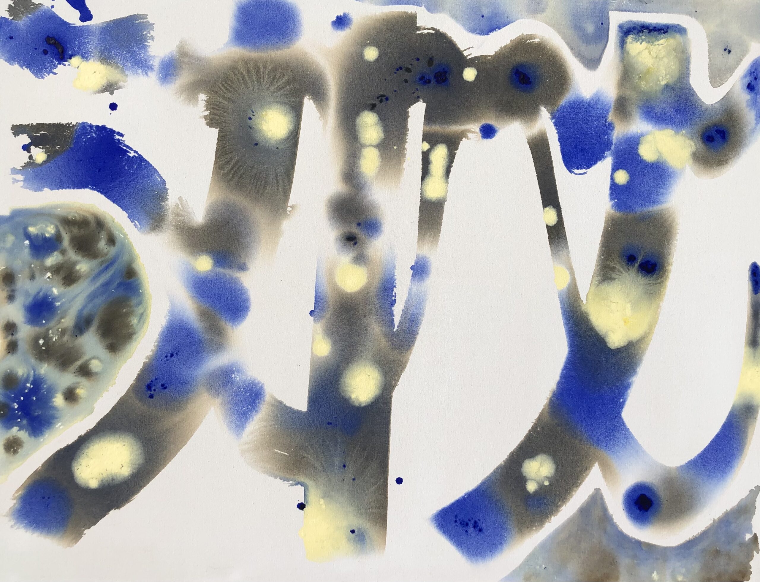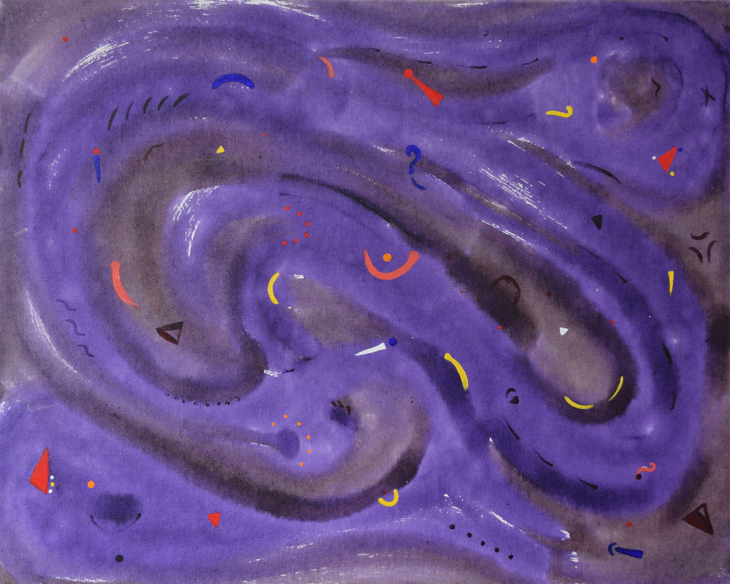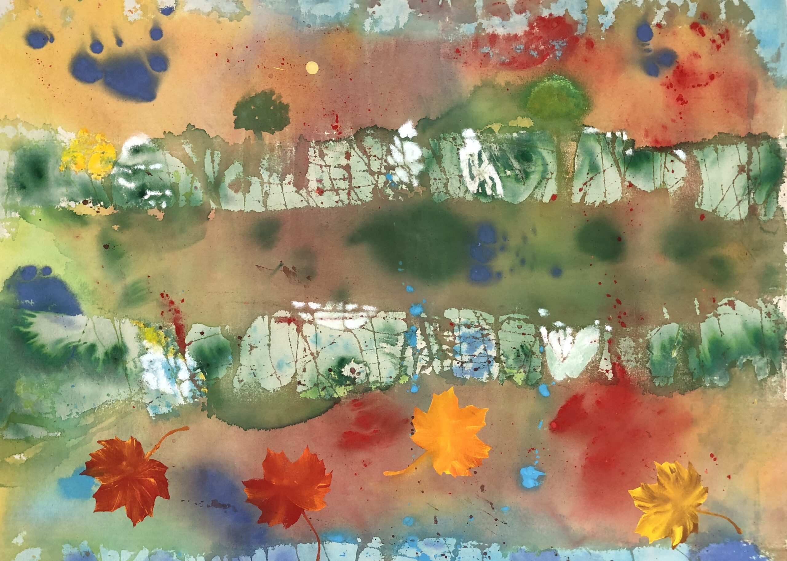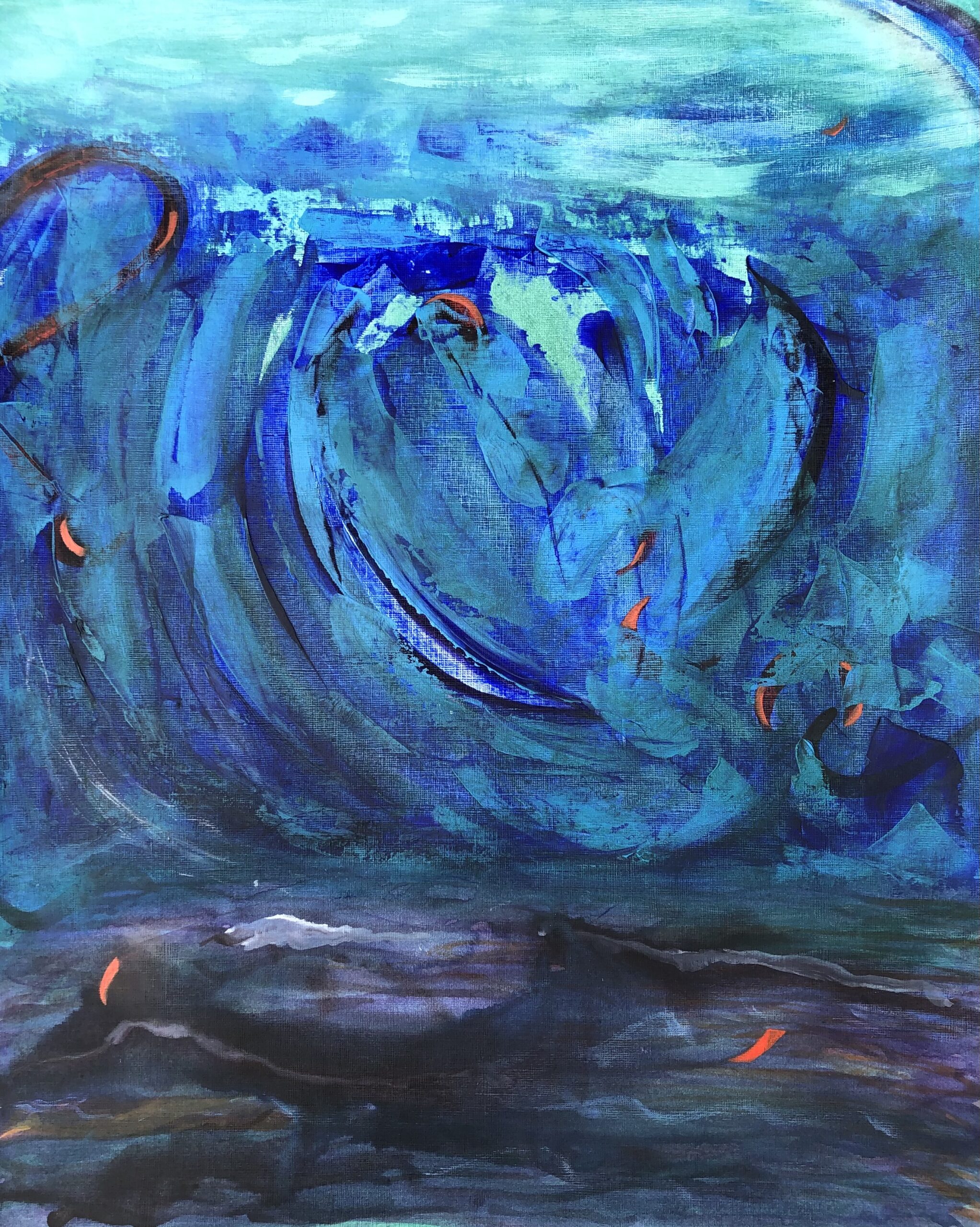 This painting is in acrylic and interference paint on watercolour paper. It evokes wonderment.