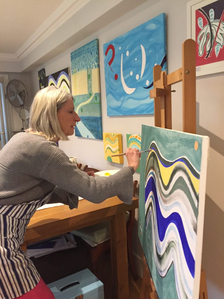 Currently my art reflects water movement both in painting technique and abstract representation. The movement of waves, net and ribbon shapes connect the solid circles, which provide a resting place to contemplate the next step. I want to create engaging conversation and connections to inspire confident fun ideas and new perspectives sharing views together. Uncertainty and certainty in the same painting. Creative organic thinking and focused sharp linear thinking giving balance in the finished art.