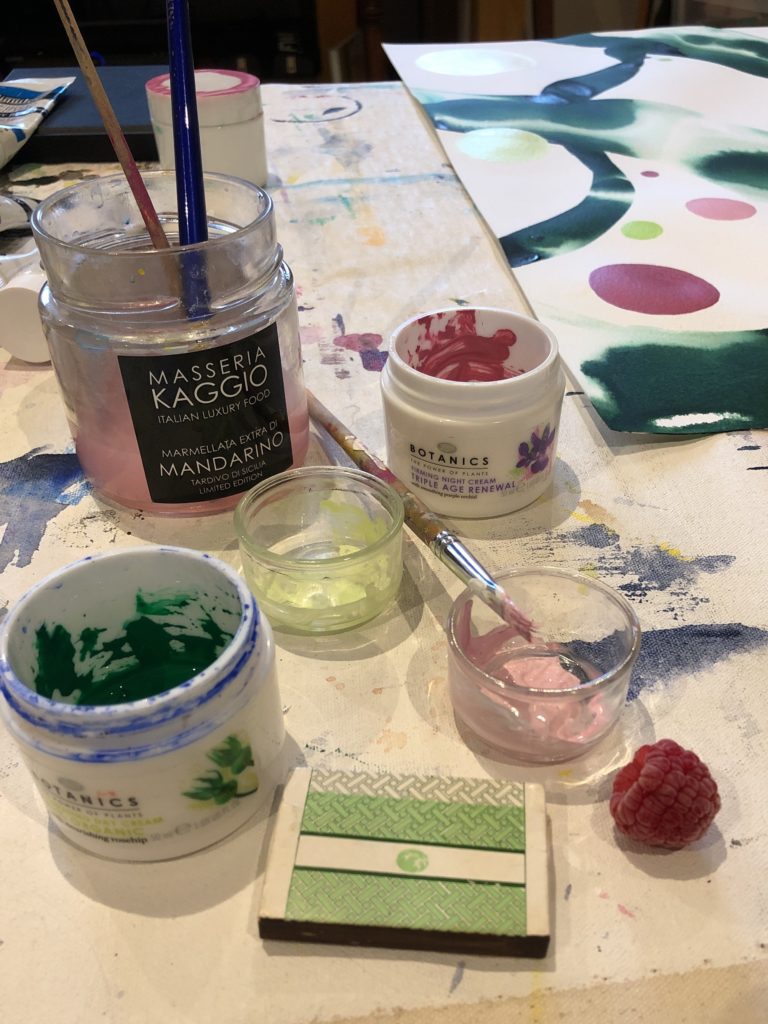 With experimentation I discovered a method to pour acrylic, the wet-on-wet technique. I brush on clear water shapes then move swiftly to drop on diluted acrylic paints into the shape. For me, using the right pot and paint consistency has been an acquired knowledge and confidence. Like a good chef, I carefully prepare all my ingredients in advance, each colour in a separate pot. I choose colours straight from the tube or blend two or more together, so the colours may stay separate or combine as they dry on the canvas. Colours and shapes are inspired by nature’s beauty in our world and everyday objects like tree bark, raspberries or matches.